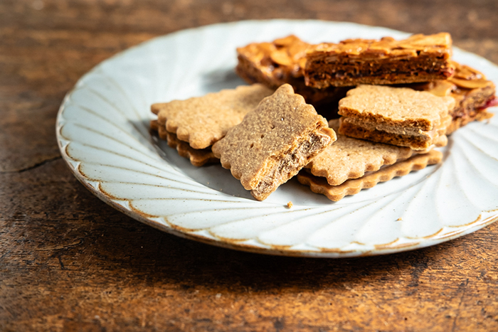 ヴァローナ社の「ドゥルセ」を使ったショコラガナッシュをサンドしたバターサブレ。